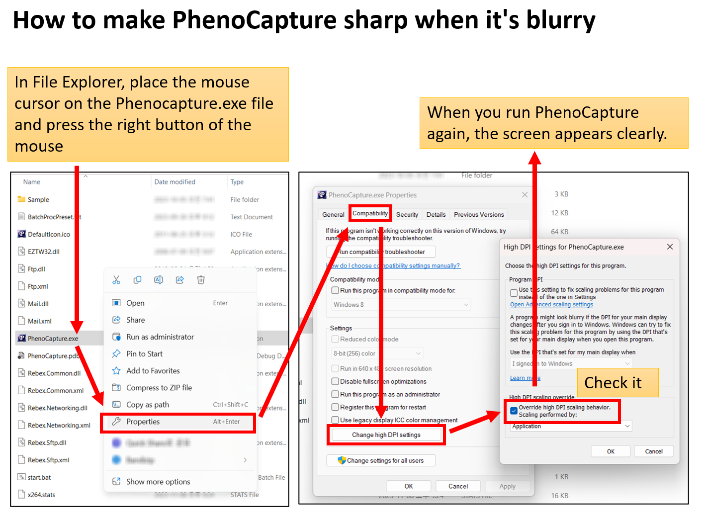 If PhenoCapture looks blurry on a high dpi monitor, please sharpen it in the following way: