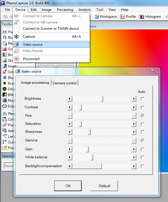 How to turn off auto-adjustment using PhenoCapture's Video Source' dialog box