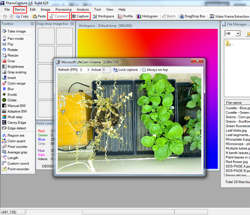 The 'Device' menu in the main toolbar provides a function to connect to a capture device. Here is a simple example. Click on the 'Connect' button to see the live view and then click on the 'Capture' button to grab the image. The 'Device' menu allows a user to connect/select/disconnect the camera, set image format/resolution, and adjust the image bright/contrast/exposure.