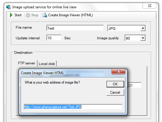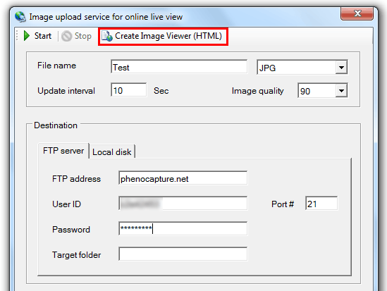 PhenoCapture is capable to automatically upload captured images to the FTP web server real-time. For the web service, you must have your own FTP web server.