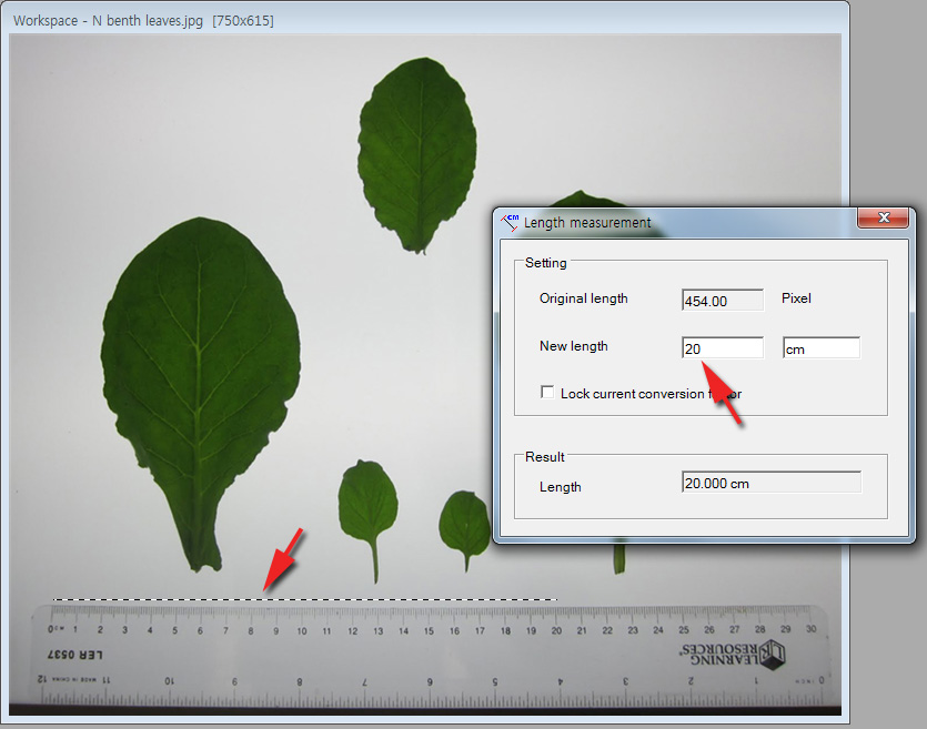 1. If you click on 'Length measurement' menu * Menu > Analysis > Length measurement you are allowed to move the selection line to a reference ruler (bottom arrow). Because the length of the line (454 pixels) is equal to 20 cm, you can set 20 cm (upper arrow)