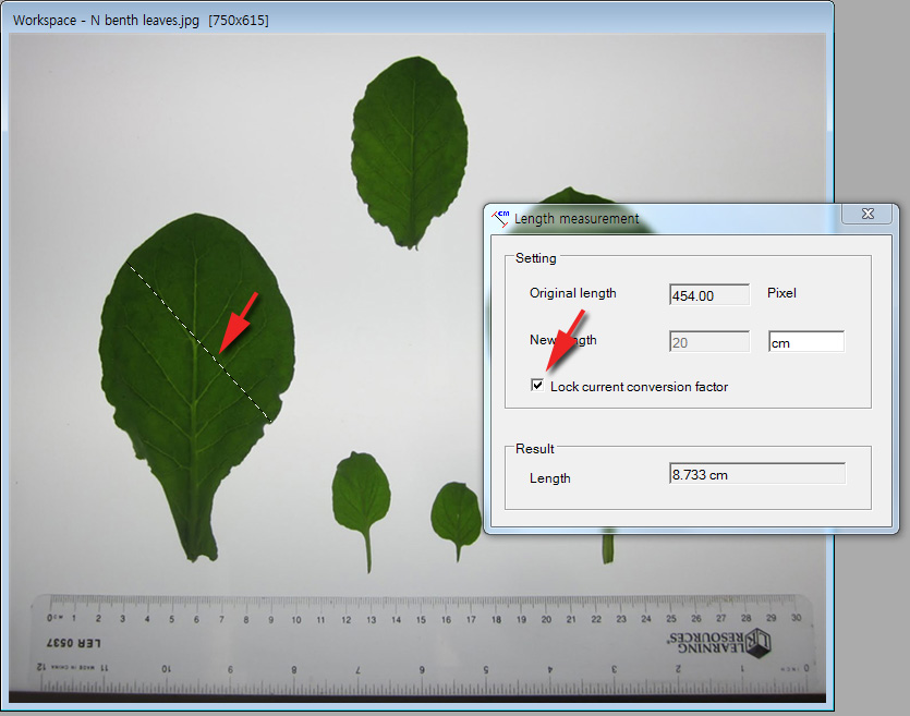 2. Click on the 'Lock current conversion factor' to maintain the same conversion factor (right arrow). Please move the selection line to another place (left arrow). As shown in the image, the current length is 8.733 cm.