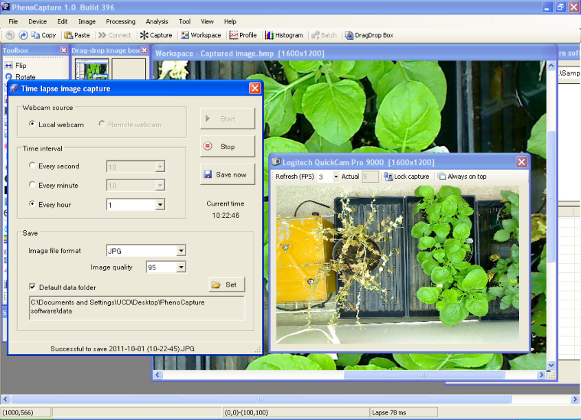 Once a USB camera or remote camera is connected, PhenoCapture allows a user to automatically take images with a given time interval.